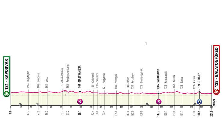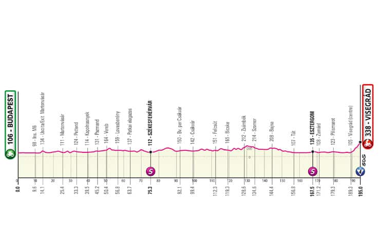 Tappa lievemente ondulata attraverso la pianura a nord della capitale fino a costeggiare il confine slovacco segnato dal Danubio presenza imponente e costante in questa zona. Si toccano alcune località di prestigio come Székesfehérvár ed Esztergom con la sua imponente basilica. Finale impegnativo una volta lasciata la riva del Danubio. Dal centro di Visegrád di sale per circa 5 km al 5% fino al castello reale dove verrà assegnata la prima Maglia Rosa al termine di una volata sempre più ristretta.