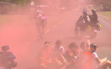 Succede di tutto nella tappa 10 del Tour de France, Morzine Les Portes du Soleil- Megève. A 35 km dal traguardo, nove manifestanti bloccano la corsa con fumogeni e un cordone che impedisce ai corridori di passare