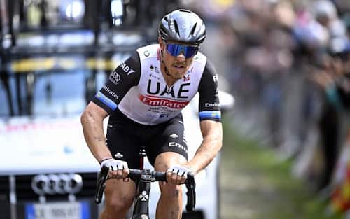 - La rabbia di Van Aert che a denti stretti prova a restare a contatto, ma non ci riesce per la foratura alla ruota posteriore