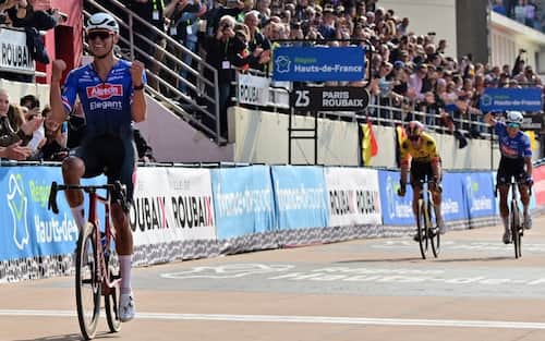 - Van Der Poel è arrivato braccia al cielo nel velodromo di Roubaix, mentre il compagno di squadra Philipsen (sullo sfondo in foto) esultava prima di completare l'ultimo giro e battere in volata Van Aert per il secondo posto