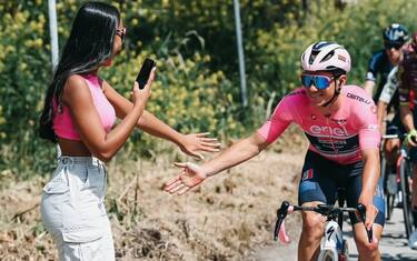 Giro d'Italia, Evenepoel in maglia rosa saluta la moglie durante 2^ tappa. Foto