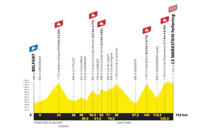 Subito dopo la partenza da Belfort, già al chilometro 24 i ciclisti sono chiamati allo sforzo di scalare il Ballon d'Alsace, 11,5 chilometri con pendenze medie del 5,3% che condurranno allo scollinamento a 1173 metri di altezza. Discesa molto tecnica e tra i chilometri 56 e 61 ci sono in rapida sequenza i GPM del Col de la Croix des Moinats e il Col de Grosse Pierre. Altri saliscendi insidiosi e nuova discesa che causerà un dislivello notevole, fino ai 390 metri di altezza a Munster. Lo sconfinamento in Germania produrrà poi un'altra difficile ascesa fino al Petit Ballon, lunga 9,3 chilometri con pendenze medie dell'8,1%.Discesa e fatica conclusiva dell'intero Tour per arrivare all'ultimo GPM, il Col du Platzerwasel (7,1 km con l'8,4%). Da qui un tratto pianeggiante di pochi chilometri fino al traguardo di Le Markstein Fellereing.
