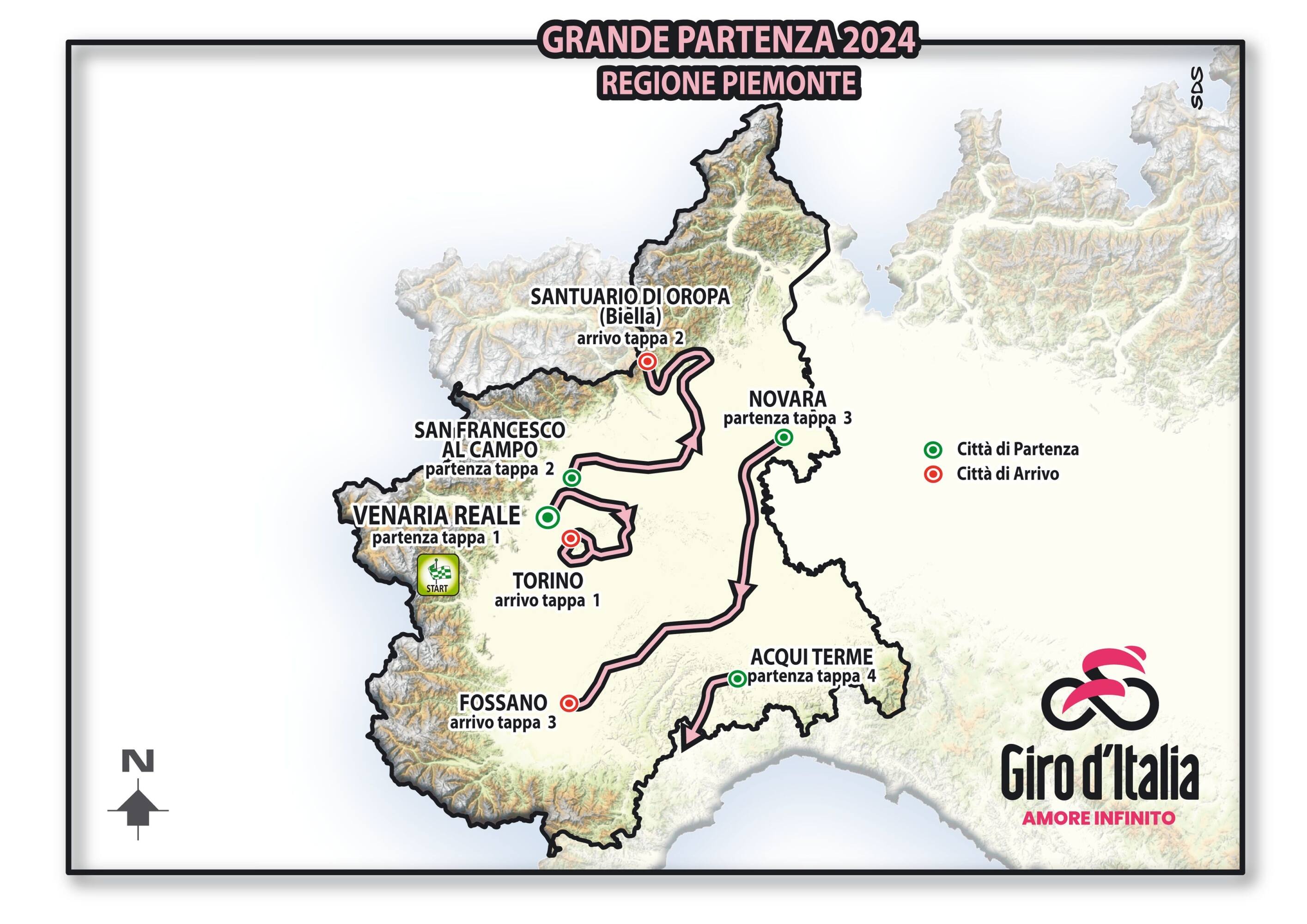 Si parte con la Venaria Reale-Torino, riedizione light della "tappa di montagna in città" che nel 2022 vide trionfare Simon Yates. Lungo i 136 km del percorso ci saranno tre GPM con passaggio sul colle di Superga a 75 anni esatti dalla tragedia che vide l'aereo che trasportava il Grande Torino schiantarsi contro la collina che sovrasta il capoluogo piemontese. Il giorno successivo sarà già tempo di arrivo in salita con la San Francesco al Campo-Santuario di Oropa (Biella) che ricorderà l'impresa compiuta da Marco Pantani al Giro d'Italia 1999. Il finale, con l'ascesa di Nelva a precedere la scalata verso il Santuario, ricalca quello del GranPiemonte del 2019 vinto da Egan Bernal. La terza e ultima tappa piemontese sarà la Novara-Fossano, adatta ai velocisti ma con uno strappo finale che potrebbe tagliar fuori gli sprinter più puri. La carovana saluterà la Regione Piemonte il 7 maggio con la quarta frazione che partirà da Acqui Terme.