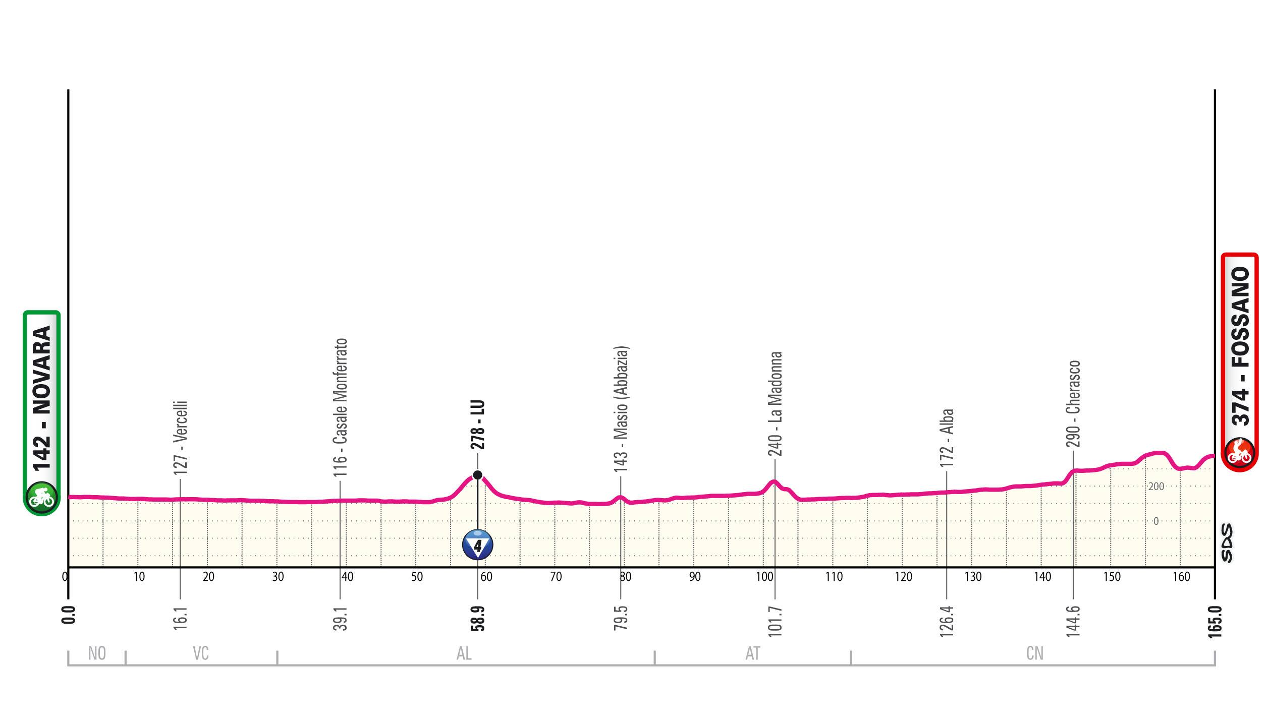 Tappa adatta ai velocisti che però dovranno conquistarsi la volata. Si attraversa la zona del riso di Novara e Vercelli per poi superare le ondulazioni del Monferrato dopo Casale. Pochissimi gli strappi come Lu e Cherasco, fino alla rampa finale che porta all’arrivo.