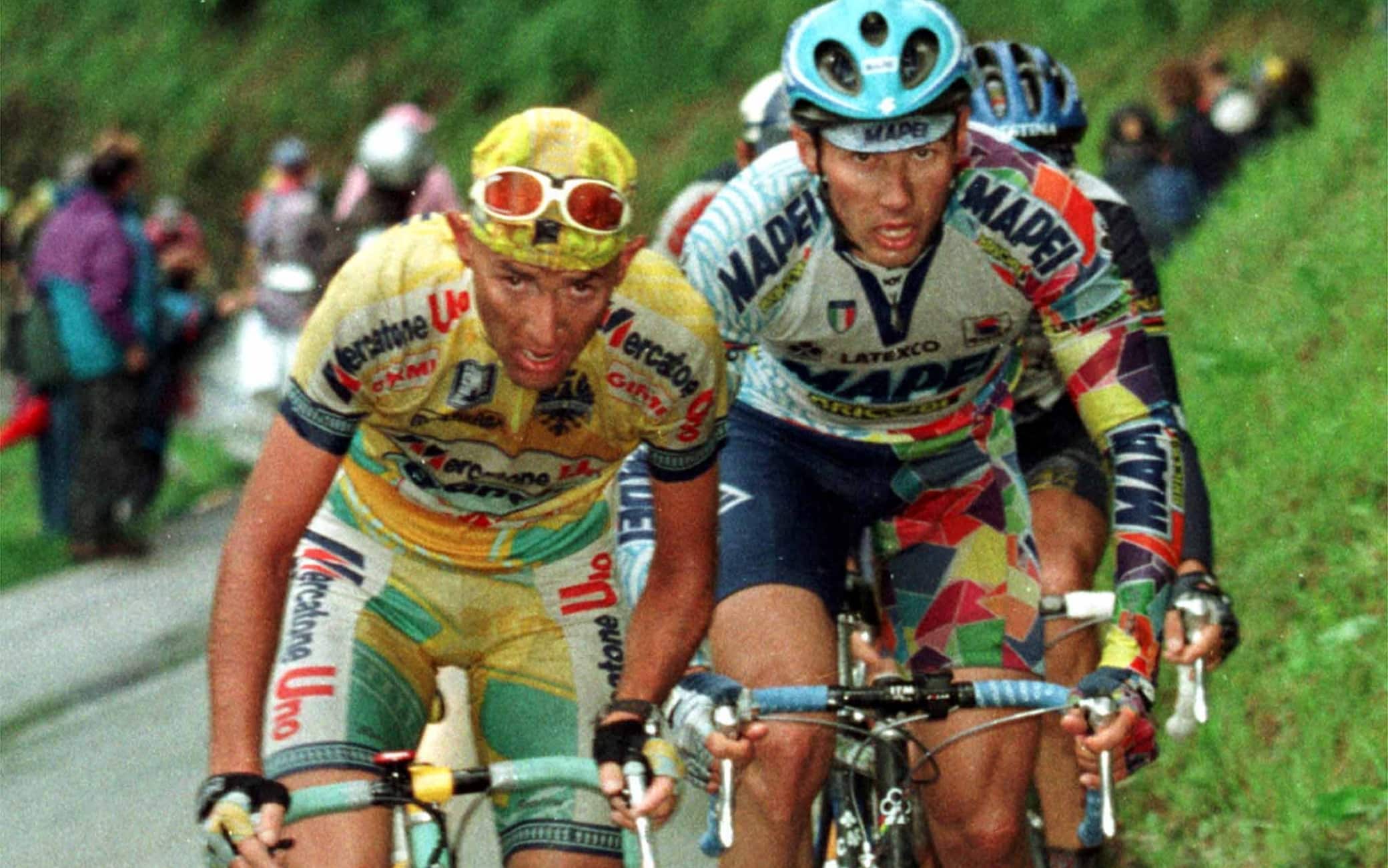 Era un ciclismo inimmaginabile quello di allora per i ragazzi d’oggi. Le gabbiette per le scarpe avevano lasciato da poco tempo spazio alle tacchette. Le bici non erano leggere come oggi. Pensate che qualsiasi bici moderna fa apparire come un pezzo di antiquariato i top di gamma dell’epoca. Il carbonio sarebbe arrivato molti anni dopo. I telai erano in alluminio. Le ruote ad alto profilo non esistevano, al massimo per le crono si usavano le lenticolari. Ma nulla a che vedere con quello che si vede in corsa oggi. I freni a disco sono una scoperta degli ultimi anni. Le leve del cambio avevano già lasciato i tubolari per andare sulle leve dei freni. E va da sé che i cambi elettronici sembravano fantascienza. Stesso discorso per gps e computerini vari. Si iniziavano a vedere i primi cardiofrequenzimetri e le crisi, di fame e non, erano abbastanza comuni. I gel non esistevano e i corridori facevano il carico di carboidrati con la pasta a colazione, con panini di rinforzo, dolci e salati in corsa. Spesso in discesa per ripararsi dal vento utilizzavano dei giornali sotto la maglia. L’obbligo del casco per l’intera durata della corsa è arrivato solo nel 2003. Non a caso uno dei gesti tipici di Pantani, un must ormai, il simbolo dei suoi attacchi: era il lancio della bandana prima dello scatto in salita.