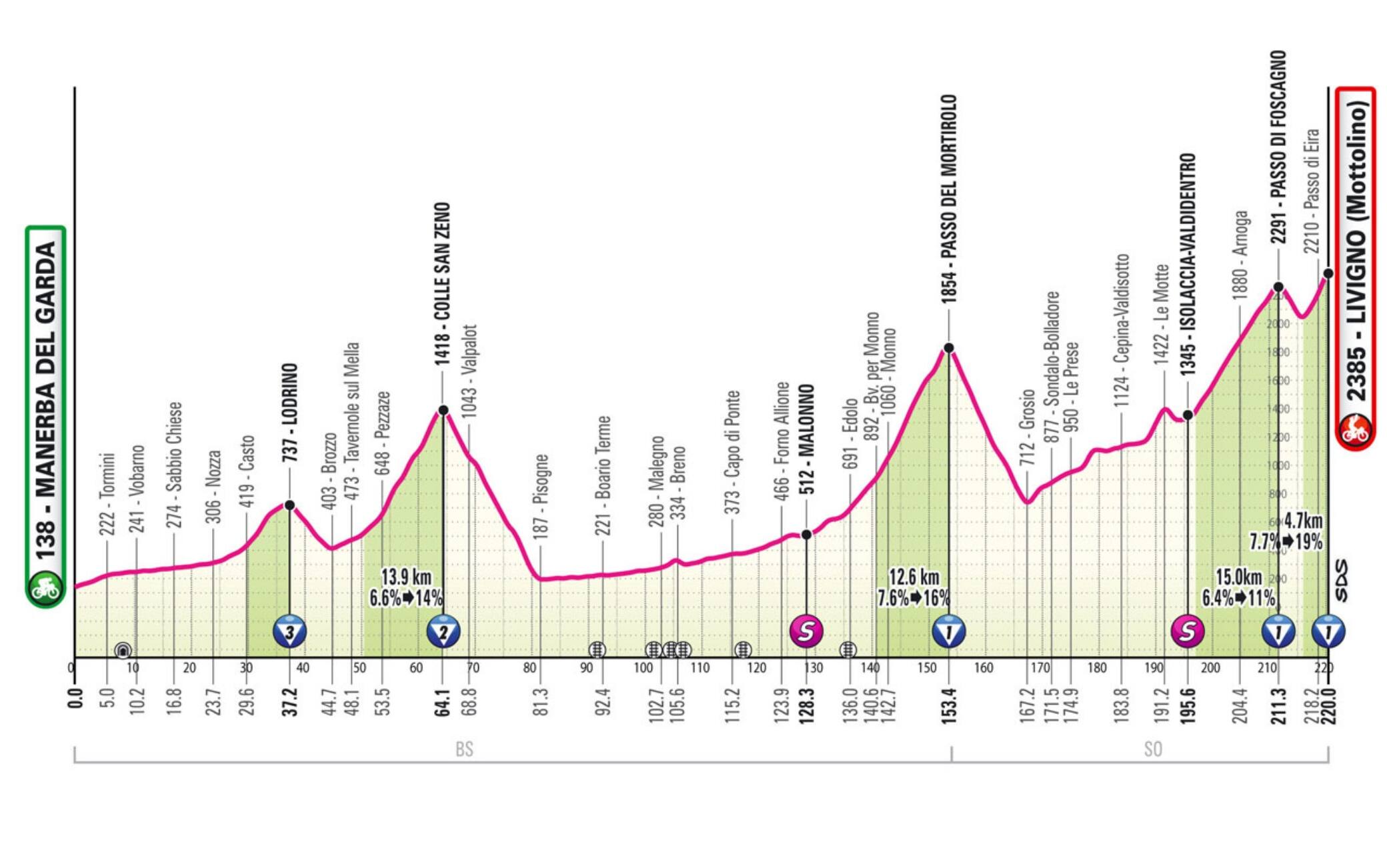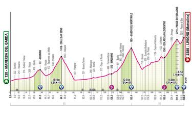 Dislivello complessivo di 2247 metri, dai 138 sul livello del mare di Manerba del Garda, sede della partenza, ai 2385 di Livigno, arrivo in salita e ultimo dei cinque GPM previsti. Il traguardo sarà un prima categoria come il Passo di Foscagno nove chilometri prima, con una discesa che permetterà ai corridori di rifiatare per prepararsi all'ultima ascesa. Ad aprire le danze ci penserà il terza categoria di Lodrino al chilometro 37, con quello di Colle San Zeno di seconda a seguire e il passo del Mortirolo a inaugurare il trittico dei tre GPM finali di difficoltà più elevata. A Malonno e a Isolaccia-Valdidentro i traguardi volanti con punti in palio per la maglia ciclamino. Corridori in strada già alle 10:40 al Km 0, con arrivo previsto alle 16:34.