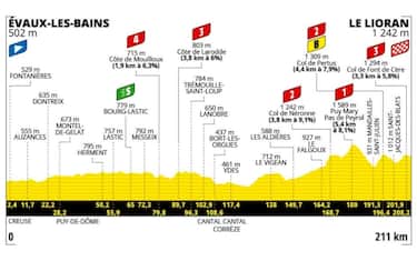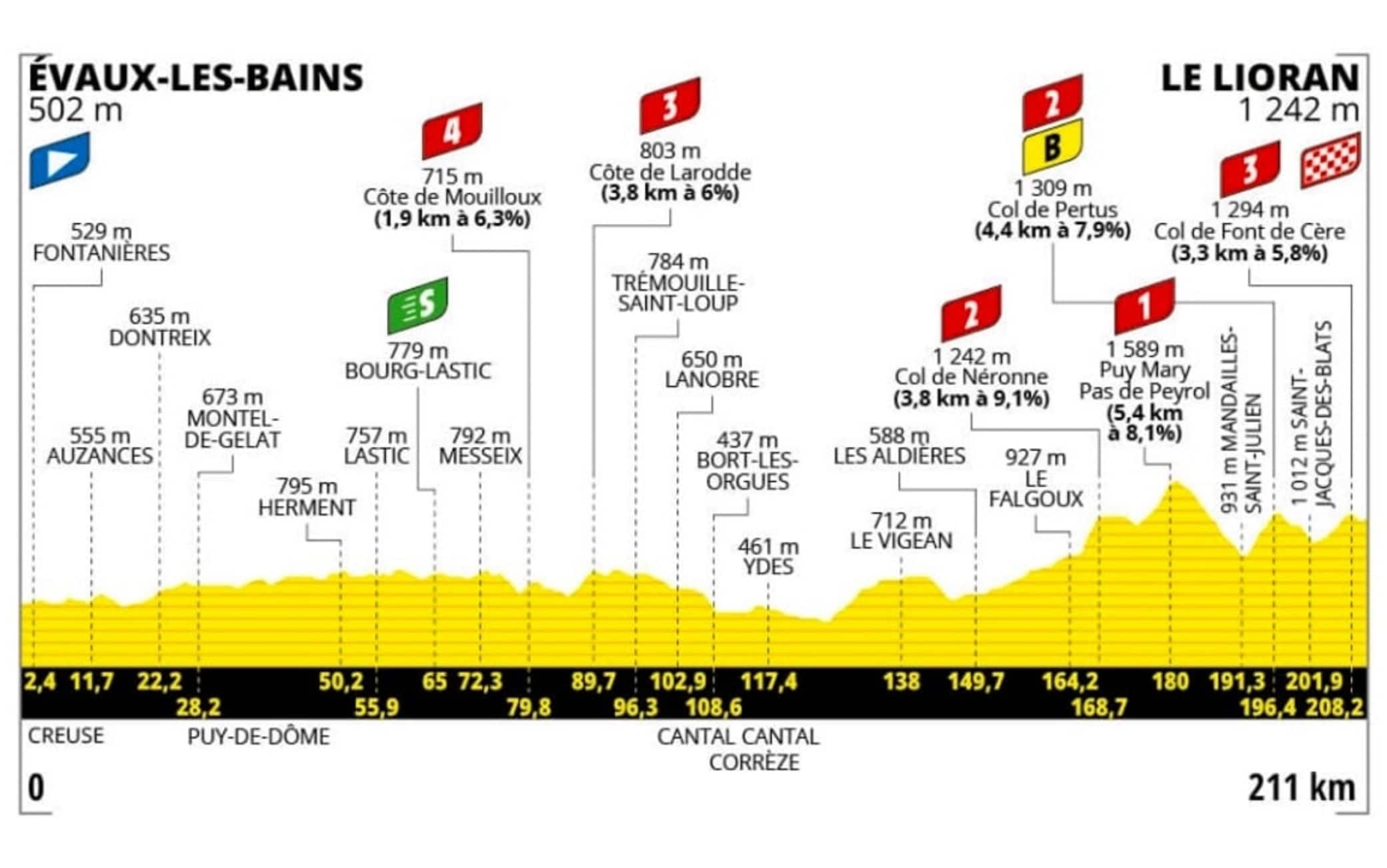 Si parte dai 502 metri di altitudine a Evaux-les-Bains per arrivare ai 1242 di Le Llorian, arrivo non in salita ma preceduto da sforzi enormi: sei GPM, di cui uno di prima categoria (Puy Mary Pas de Peyrol, salita di 5,4 km con pendenza media dell'8,1%), due di seconda (Col de Neronne, 3,8 km con il 9,1% e Col de Pertus, 4,4 km con il 7,9%), due di terza (Cote de Larodde, 3,8 km con il 6% e e Col de Font de Cere, 3,3 km con il 5,8%) e uno di quarta, il primo che si incontrerà sul percorso, vale a dire il Cote de Mouilloux (1,9 km con il 6,3%). Probabilmente il gruppo arriverà compatto al traguardo volante di Bourg-Lastic, al km 64, per consentire ai velocisti di giocarsi punti preziosi per la maglia verde. Subito dopo inizierà un logorante saliscendi che si chiuderà con il Col de Font de Cere a 3 km dal traguardo.
