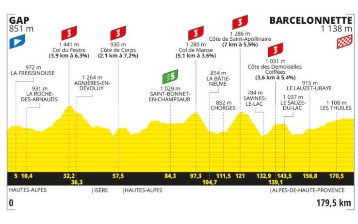 Se nella frazione odierna i tre GPM erano tutti concentrati nel finale, domani invece le cinque vette saranno sparse in maniera uniforme lungo il percorso. Si parte con il Col du Festre (3,9 km con pendenza media del 6,3%), si prosegue col Cote de Corps (2,1 km con il 7,2%), il Col de Manse (5,1 km con il 3,6%), il Cote de Saint-Apollinaire (7 km con il 5,5%) per finire con il Cote des Demoiselles Coiffees (3,6 km con il 5,4%), ultima cima a 40 km dal traguardo. Da considerare anche il traguardo intermedio di Saint-Bonnet-en-Champsaur al km 84,3.