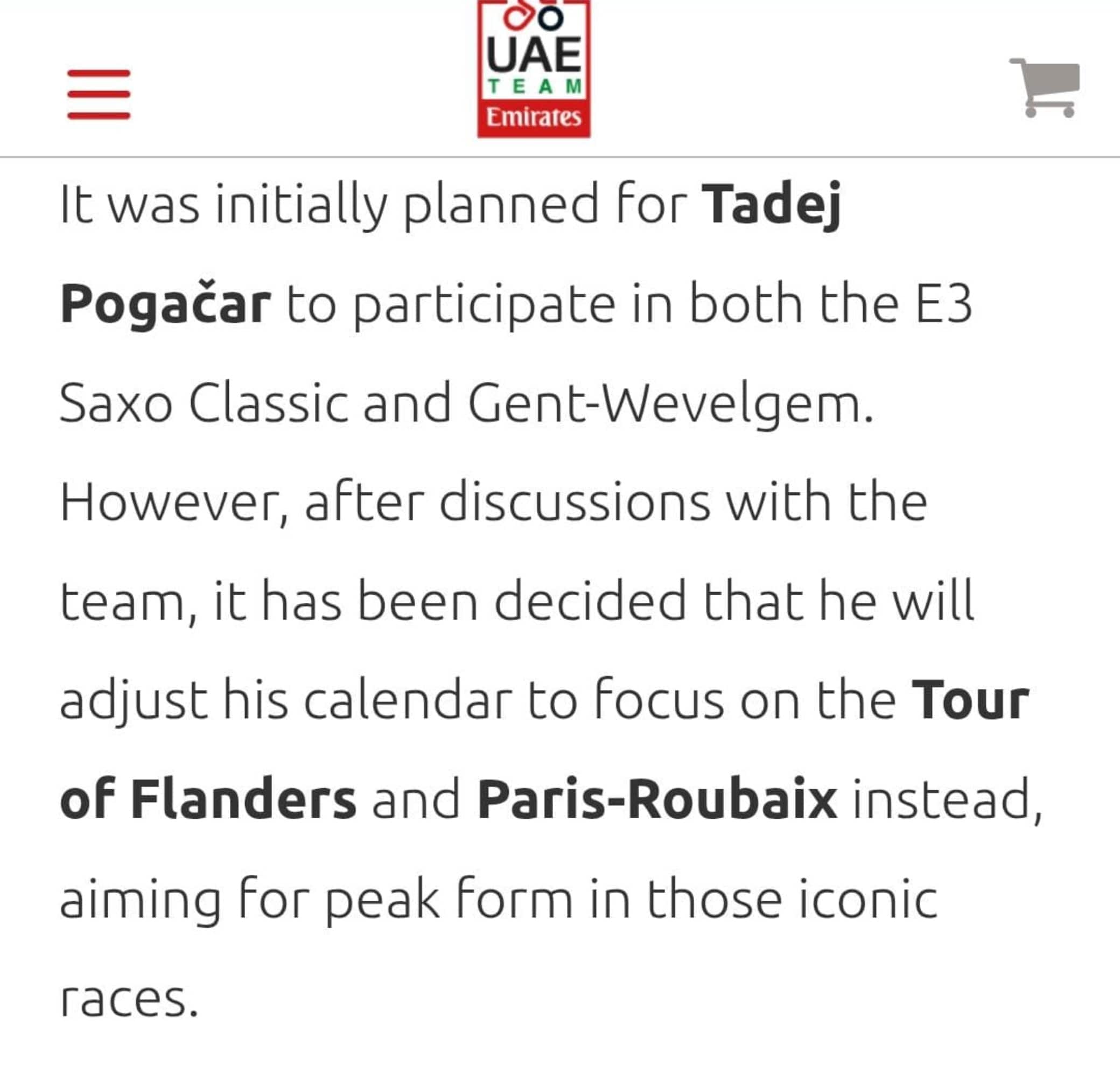 Tadej Pogacar prenderà parte alla prossima Parigi-Roubaix: ora è ufficiale. La UAE Team Emirates lo ha annunciato comunicando la modifica del roster per la E3: "Inizialmente era previsto che Pogacar partecipasse sia all'E3 Saxo Classic che alla Gent-Wevelgem - si legge sul sito ufficiale - tuttavia, dopo aver discusso con il team, è stato deciso che modificherà il suo calendario per concentrarsi sul Giro delle Fiandre e sulla Parigi-Roubaix, puntando alla forma migliore in quelle gare iconiche". La gara - nota anche come L'Inferno del Nord - è in programma domenica 13 aprile. Per il 26enne si tratterà dell’esordio assoluto nella 'regina delle classiche', unica Monumento alla quale finora non ha mai partecipato.