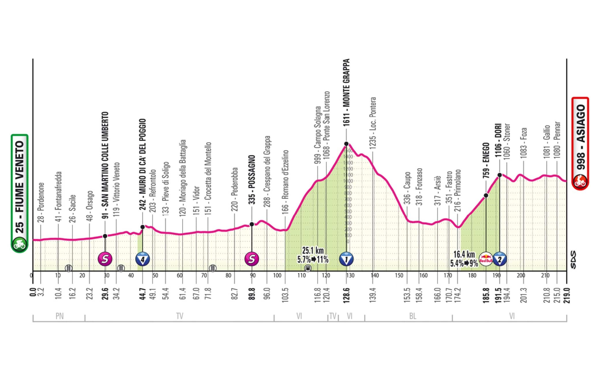Dopo quanto successo nella 14^ tappa, con la maxi-caduta a circa 20 km dalla fine che ha rivoluzionato la classifica generale, iniziano le dure fatiche per i corridori con la tappa da Fiume Veneto ad Asiago. Tappa di montagna con la prima parte pianeggiante fino alle porte di Bassano del Grappa seguita da due lunghe salite che portano sull'Altopiano di Asiago. Si scala nella prima parte il Muro di Ca' del Poggio per superare poi il Piave e raggiungere Possagno e Romano da Ezzelino. Da qui inizia la salita di 25 km che porta alla cima del Monte Grappa, il protagonista di questa corsa. Parliamo di un GPM di prima categoria con i suoi 1611 metri di altitudine, pendenze massime di ascesa dell'11% e lungo oltre 25 chilometri. Altro GPM a Dori, poco distante dal traguardo di Asiago.