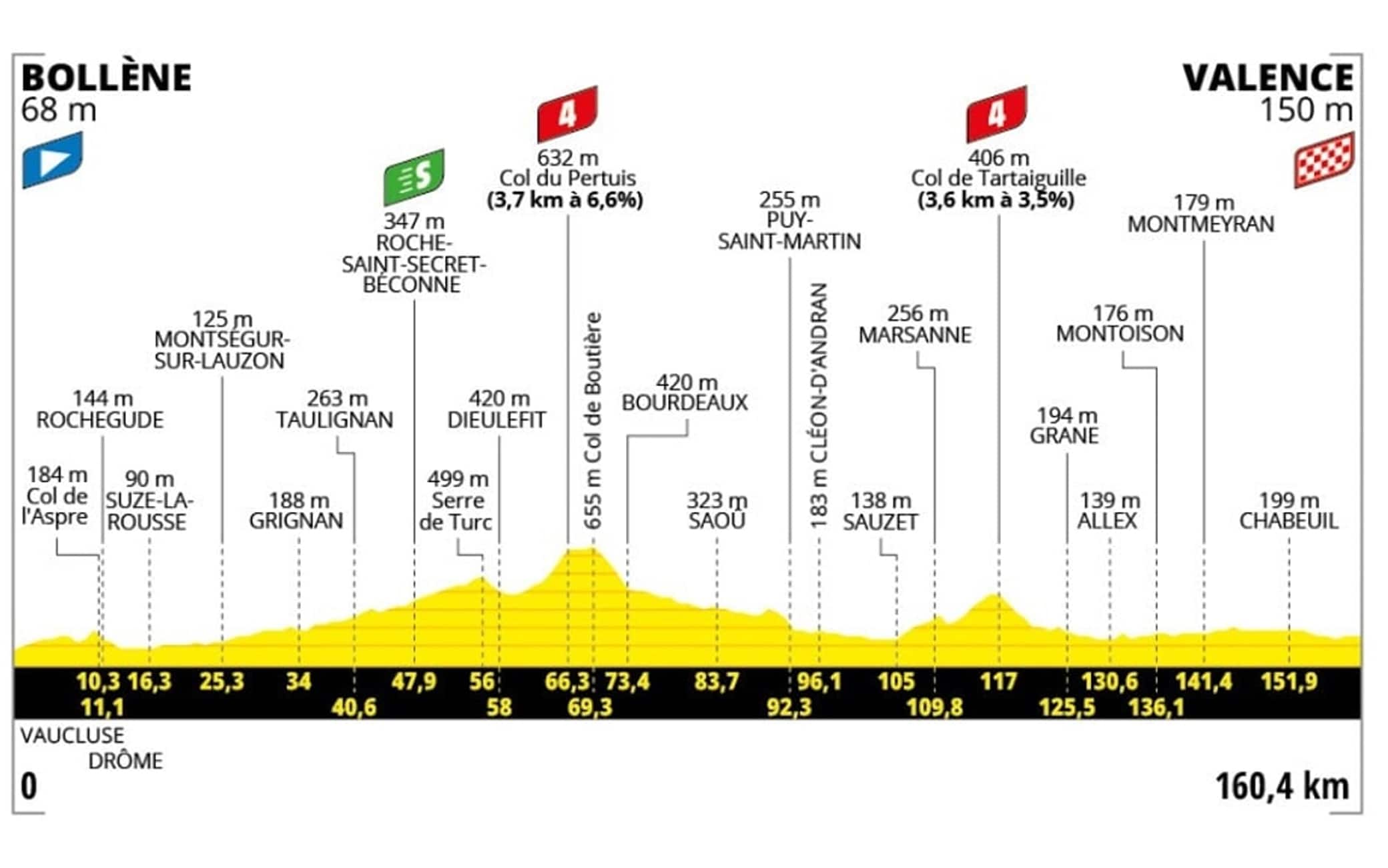 Non è una frazione totalmente pianeggiante sulle strade del Vaucluse e della Drôme, con un paio di GPM di quarta categoria: il Col du Pertuis (3.7 km al 6,6% di pendenza media) e il Col de Tartaiguille (3.6 km al 3.5% di pendenza media), preceduti dal traguardo intermedio dopo una cinquantina di km dalla partenza. L'ultima ascesa arriva a oltre 40 km dal traguardo, ma attenzione al vento che potrebbe creare pericolosi ventagli.