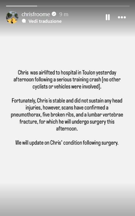 Chris Froome è stato vittima di un incidente stradale nella giornata di mercoledì 27 agosto durante un allenamento. Secondo quanto riportato dai media francesi, il britannico è caduto nei pressi di Saint-Raphaël (Var) in Francia ed è stato poi trasportato in elicottero all'ospedale di Tolone. Il quattro volte vincitore del Tour de France (2013, 2015, 2016 e 2017) è rimasto gravemente ferito ma è sempre stato cosciente riuscendo persino a parlare con il suo entourage. Non ha riportato traumi cranici e le sue condizioni sono stabili. Gli esami hanno rilevato un pneumotorace, la frattura di cinque costole e la frattura delle vertebre lombari. Sarà sottoposto a intervento chirurgico questo pomeriggio. Si attendono ulteriori aggiornamenti sulle condizioni del corridore. Froome era già rimasto coinvolto in un incidente nel 2019 durante la ricognizione di una cronometro del Giro del Delfinato: costretto a una lunga riabilitazione, non era più riuscito a tornare ai precedenti livelli.