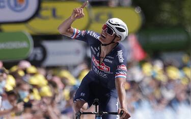 Jonathan Milan, giunto sul traguardo di Parigi, può festeggiare la conquista della maglia verde...