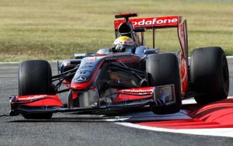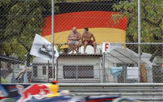 Due tifosi tedeschi appostati su un camper per vedere le auto sfrecciare sul circuito.