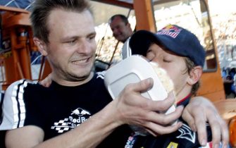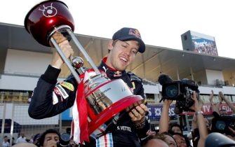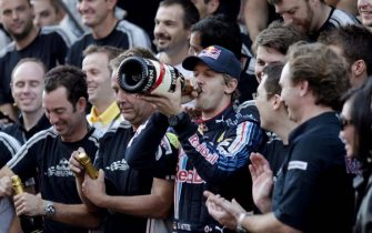 Sebastian Vettel festeggia il terzo successo stagionale con una bella bevuta di champagne