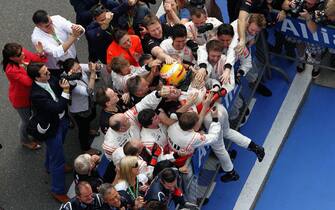 Lewis festeggiato dal suo team al traguardo con grandi pacche sul casco