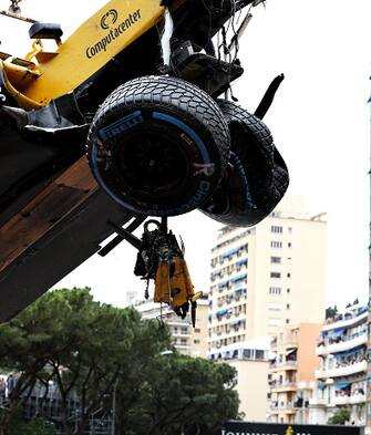 Palmer soccorso dai commissari di pista dopo l'incidente che lo ha costretto a ritirarsi dal GP di Monaco. A causare l'uscita di scena del pilota inglese, la pista bagnata -