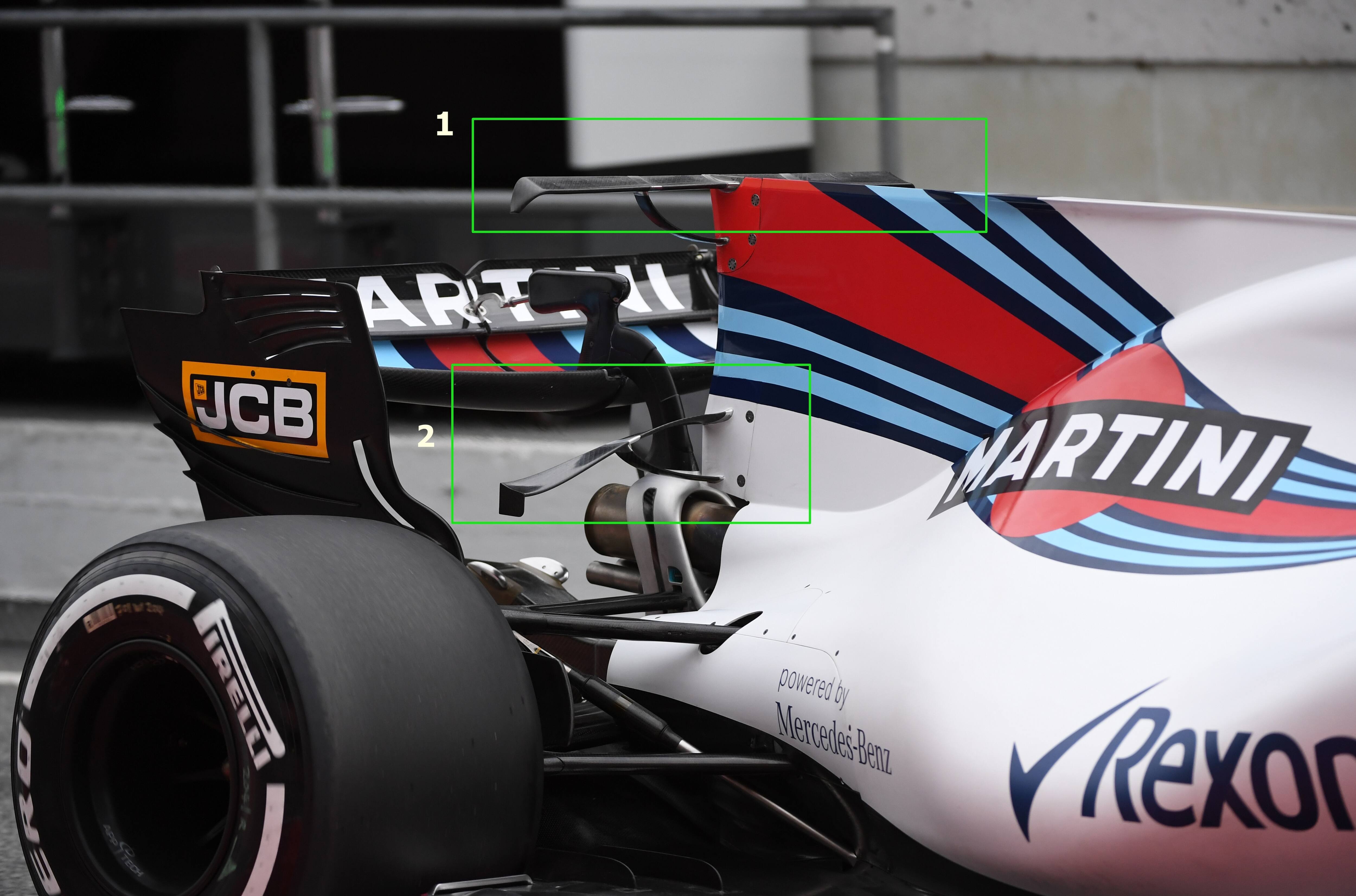 Dopo aver effettuato i primi giri con la T-Wing (1) montata sull'estremità della pinna è stata introdotta, successivamente un secondo profilo aerodinamico (2) in una posizione inedita. Soluzioni studiate dagli aerodinamici di Grove per migliorare l'efficienza dell'ala posteriore che si trova in una posizione più bassa rispetto al 2016.
