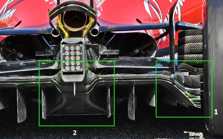 Si è notato fin dal Filming Day effettuato dalla SF70H a Fiorano dell'assetto rake che presenta questa vettura. Assetto picchiato che risulta molto utile poiché grazie ad un maggior angolo tra la parte anteriore e posteriore della vettura aiuta a "schiacciare" il flusso turbolento al di sotto dell'ala, aumentando cosi l'efficienza di generazione del carico aerodinamico dell'ala posteriore. Proprio per far funzionare un assetto rake così spinto, a Maranello, hanno lavorato molto sul diffusore, soprattutto, nella zona esterna (1) che presenta, rispetto al 2016, un maggior numero di profili che energizzano il flusso in una zona nevralgica del diffusore.