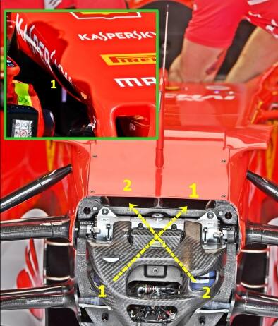 La prima gara stagionale ci ha permesso di scoprire alcuni dettagli sulla nuova vettura di Maranello che durante i test non si erano potuti vedere. La sospensione anteriore mantiene lo stesso schema della SF16H, con un terzo elemento a molla (freccia verde) comandato idraulicamente. Con la freccia gialla è indicato l’alloggiamento delle barre di torsione.