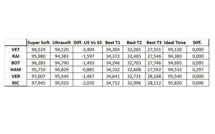 In condizioni da qualifica, le gomme ultra soft si sono dimostrate molto più veloci rispetto alle Super Soft. Pirelli si aspettava una differenza prestazionale di circa 1s, mentre i dati della pista sono stati molto diversi. I distacchi nella giornata di domani, a causa della gommatura della pista, potrebbero ridursi ed avvicinarsi alle stime del costruttore di pneumatici.