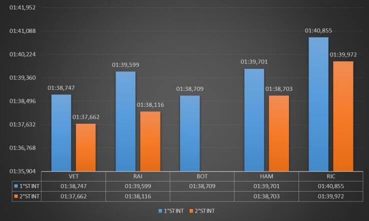 Nel secondo stint Vettel è stato il più veloce distanziando, a parità di gomma, Hamilton di 1 s. Va detto che il pilota inglese avendo effettuato un primo stint piuttosto corto disponeva di un quantitativo di benzina maggiore rispetto a Vettel. In ogni caso, il distacco tra i due è stato piuttosto elevato e la Mercedes dovrà analizzare molto attentamente i dati per cercare di risolvere i propri problemi prima di qualifiche e gara.