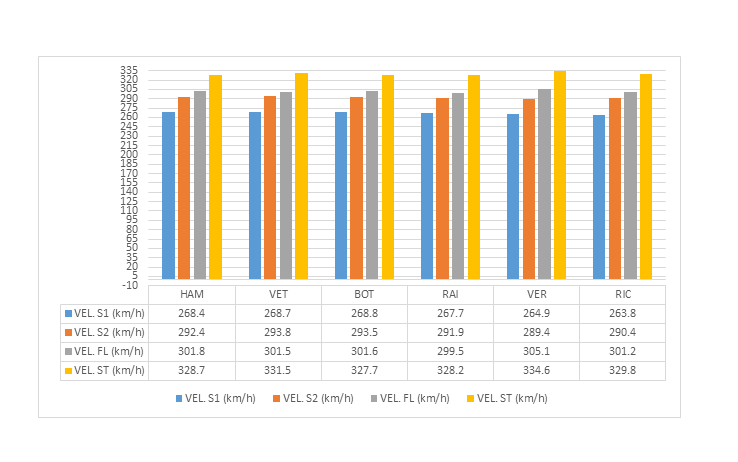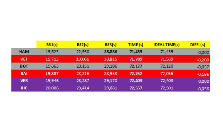 Hamilton, in una delle sue piste preferite, ha guidato in maniera stupefacente riuscendo a realizzare un giro meraviglioso. Analizzando i best sector si nota come il pilota inglese sia riuscito a realizzare il “giro perfetto” staccando il proprio compagno di squadra (terzo) di ben 7 decimi.