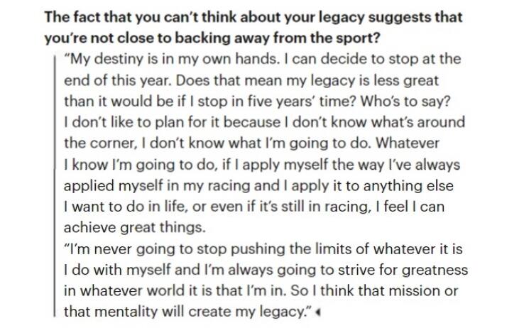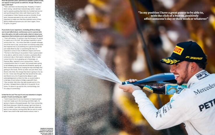 Quello che mette tutti d’accordo è il passaggio su Ayrton Senna, dopo aver eguagliato il suo primato di pole position (65): “Voglio diventare come lui, mi piacerebbe che i tifosi mi ricordassero nella stessa maniera: un pilota duro ma corretto. Da bambino seguivo altri campioni, altri modelli. Quelli che guardava mio padre, come Muhammad Alì. Da quando ho cominciato a correre ho sempre avuto Senna come riferimento. Quando mi ritirerò spero che la gente rispetti il mio impegno e il mio stile di guida, come quelli di Ayrton".