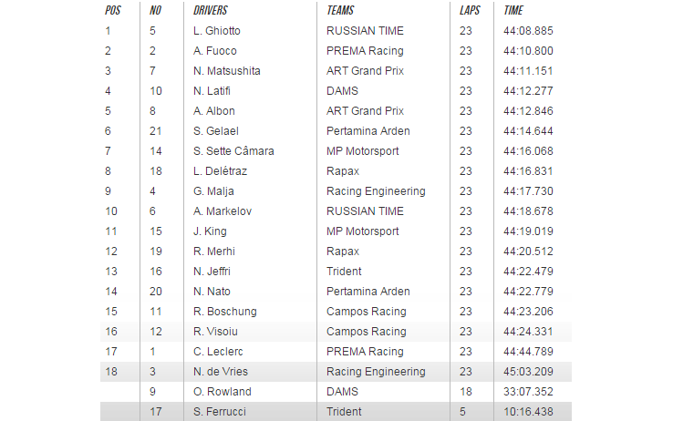 Con condizioni meteorologiche approssimative e decisamente instabili, su un asfalto molto umido e in alcuni tratti insidioso, le auto si sono schierate al via per percorrere i trenta giri previsti sul tracciato di Monza, in condizioni tuttavia di sicurezza che hanno permesso la partenza dalla griglia, ma solo dopo otto giri extra dietro la safety car. Ottima la partenza di Leclerc che in poche curve recupera quattro posizioni e poi supera anche Matsushita ponendosi alle spalle di De Vries, partito davanti e sgusciato via. Dietro risale anche Rowland con grinta e cattiveria dopo un lungo e spettacolare duello con Mehri. In sei giri Leclerc torna anche su De Vries. Gran battaglia fra De Vries e Leclerc con Rowland in rimonta almeno fino al giro dei pit obbligatori. In uscita dai box Rowland perde la ruota posteriore sinistra forse mal fissata. Safety car. Alla ripartenza lanciata sono tutti molto vicini, con Ghiotto e Fuoco rispettivamente terzo e quarto.
