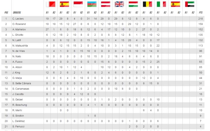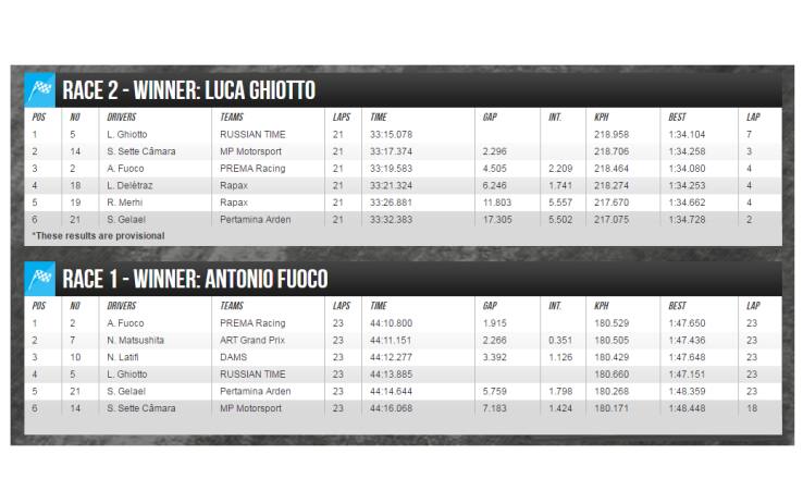 In Gara 2, partenza al palo per Malja, con Ghiotto a scattare dalla terza fila, Fuoco dalla quarta, Markelov dalla quinta, il leader del campionato Leclerc dalla penultima linea, davanti al suo avversario più vicino Rowland. Gara spettacolare e in apnea per tutta la sua durata, vinta da un caparbio e cattivissimo Ghiotto che così si è ripreso il successo toltogli a tavolino dai giudici in gara 1, davanti a Deletraz e un eccellente Antonio Fuoco. Molta Italia (due piloti e le due Rapax di Deletraz e Mehri immediatamente dietro) e per una volta Leclerc fuori dai punti in entrambe le gare ma ancora leader del campionato: Rowland e Markelov sono arrivati alle sue spalle e il suo vantaggio a due eventi dal termine resta immutato.