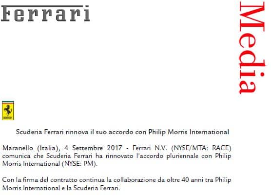 Nel pieno del testa a testa 2017 arriva un altro tassello importante per la continuità e la stabilità. Philip Morris ha infatti confermato la sua presenza, con un nuovo accordo pluriennale, quale sponsor principale della rossa. Il binomio, ormai quarantennale, garantisce alla Rossa una stabilità economica per investimenti presenti e futuri, soprattutto per spingere ancor di più nella rincorsa per ai due titoli che mancano rispettivamente dal 2008, il costruttori e dal 2007 quello piloti.