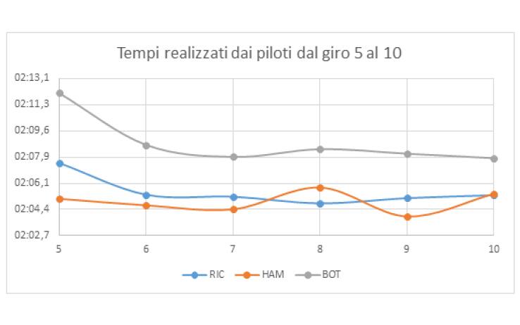 Se andiamo ad analizzare il ritmo medio di questo primo stint di gara possiamo notare che Hamilton nella prima parte di gara, ha inflitto un distacco di 7 decimi a Ricciardo e di ben 3,3 s a Bottas.