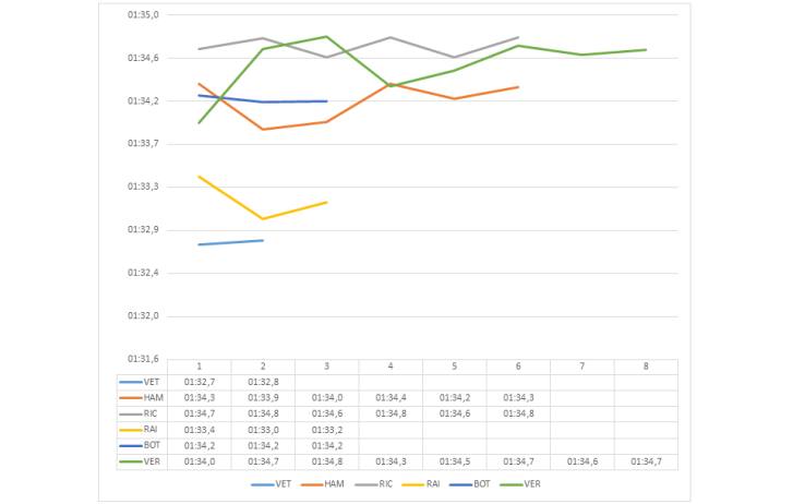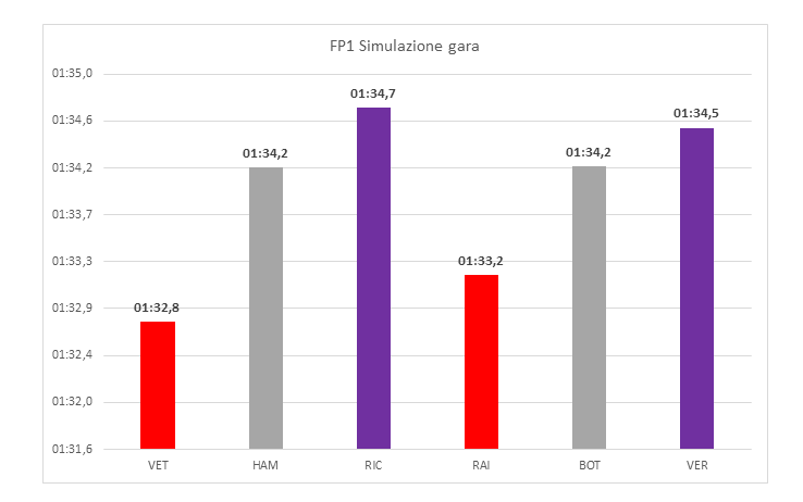 Durante i pochi giri fatti in simulazione di gara con il compound Super Soft, emerge che il gap tra Ferrari e tutte le altre monoposto è piuttosto grande, ciò è dovuto principalmente ai diversi quantitativi di benzina imbarcati sulle vetture.
