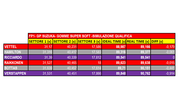 Nella simulazione di qualifica, Vettel, non è riuscito a sfruttare il massimo potenziale della gomma Super Soft a causa della bandiera rossa che i commissari hanno esposto per l’incidente di Sainz. Analizzando i best sector si può notare che l’ideal-time di Vettel sarebbe potuto essere migliore di quasi 2 decimi rispetto al tempo realizzato.