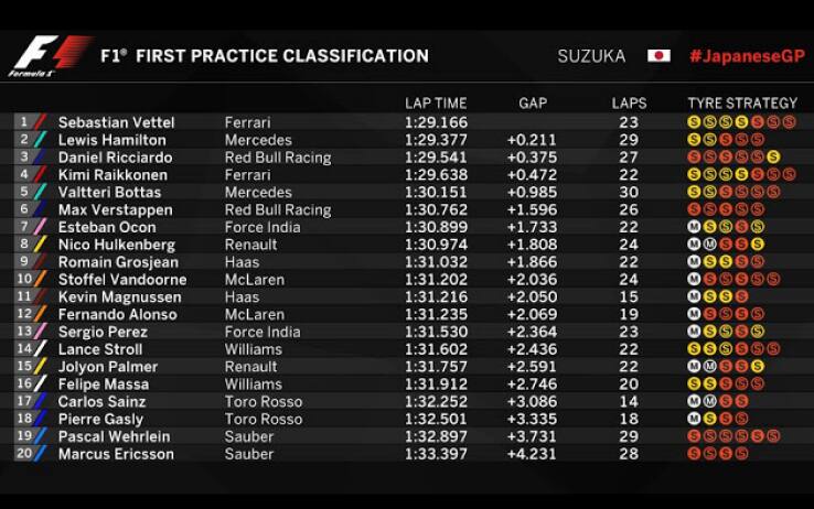 A Suzuka nelle FP1 il più veloce è Vettel, seguito da Hamilton attaccato a soli due millesimi. Faticano a mantenere il passo le due Red-Bull. Quasi nessuno è sceso in pista per le FP2 a causa della pioggia battente. Da segnalare la conferma del nuovo pacchetto aerodinamico in casa Mercedes e una piccola modifica all’ala posteriore per la SF70H