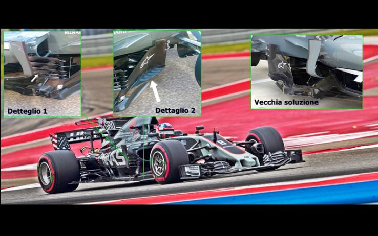 Completamente rivoluzionata la Haas nella zona dei bargeboards. Colpisce il cambio di linea di progettazione che si discosta dalla SF70H per andare a “sposare” alcuni concetti aerodinamici utilizzati sulla Mercedes W08 che, fin da inizio stagione, ha puntato molto sull’efficienza aerodinamico cercando di contenere molto la resistenza all’avanzamento.