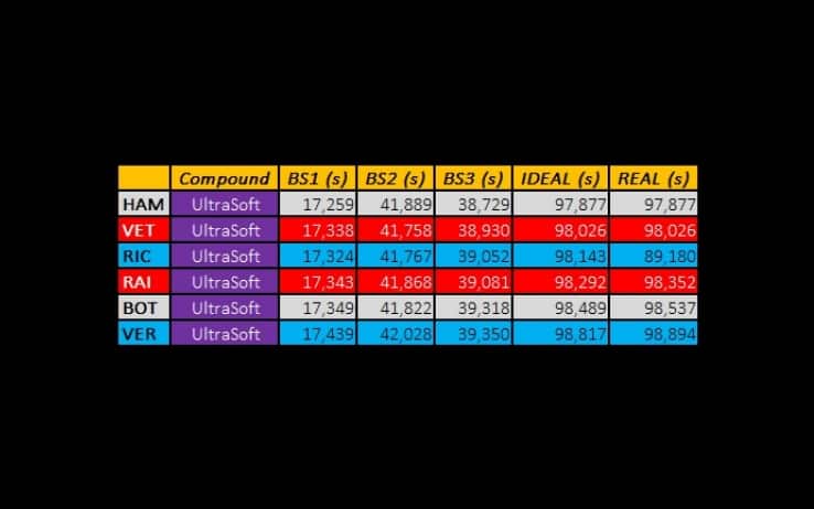 Nella simulazione di qualifica, effettuata da tutti i piloti con le gomme Ultra Soft, il pilota più rapido è stato Hamilton che è riuscito a staccare la Ferrari di Vettel di 149 millesimi. Se osserviamo l’ideal time possiamo vedere che, sia Hamilton che Vettel, hanno realizzato il loro giro perfetto.