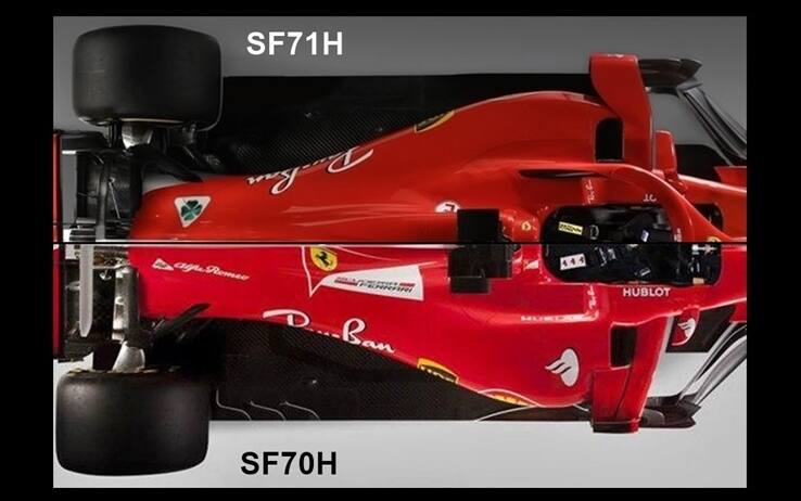 Le prese di raffreddamento sulle fiancate sono state estremizzate e sono di dimensioni molto contenute se confrontate con quelle della SF70H. Questa soluzione ha permesso ai tecnici del Team di Maranello di liberare spazio sul fondo vettura e di contenere di conseguenza le dimensioni trasversali delle pance che creano disturbi al flusso diretto verso il posteriore della vettura.