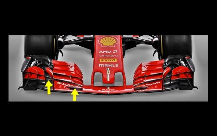 Confermato il sistema S-Duct che ha la funzione di incanalare l'aria turbolenta da sotto il naso espellendola sotto forma di flusso laminare al di sopra della vettura. La posizione dell'ingresso del sistema è rimasta invariata. Ferrari continuerà ad utilizzare un condotto ad S molto meno pronunciato e quindi con una maggiore efficienza.