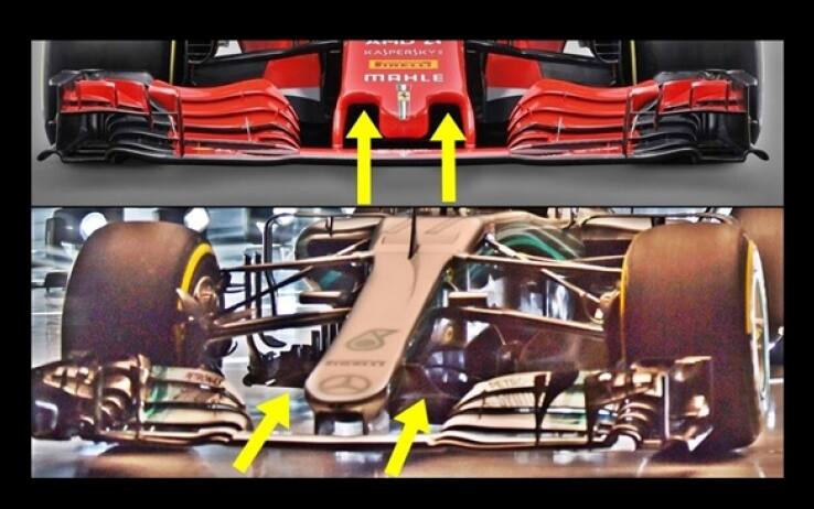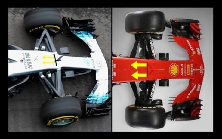 In sintesi, ad una Mercedes W09 che sfrutta l'aria passante esternamente ai piloni di sostegno, si contrappone una Ferrari SF71H che invece impiega principalmente il flusso passante all'interno dei piloni e al di sotto del muso.