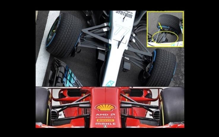 Su Mercedes lo schema è rimasto push rod con terzo elemento completamente idraulico. Per migliorare la pulizia aerodinamica i tecnici del team anglo tedesco hanno confermato il collegamento a pivot tra il triangolo superiore e il portamozzo. Questa soluzione consente di alzare il braccio superiore della sospensione, andando così a influenzare meno il flusso in arrivo alle bocche di raffreddamento dei radiatori. Rispetto al 2017 è stato leggermente arretrata la posizione del puntone.