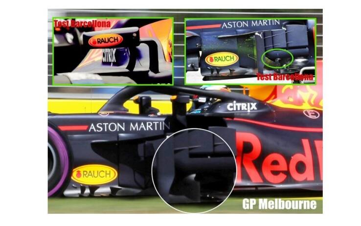 La Red Bull RB14 era sicuramente una delle vetture più attese in Australia dopo le ottime prestazioni offerte durante i test invernali. Per questo primo appuntamento sono stati portati alcuni sviluppi nella zona degli specchietti retrovisori dove il supporto è rimasto sdoppiato ma il profilo più esterno è stato spostato nella parte bassa della bocca di raffreddamento.