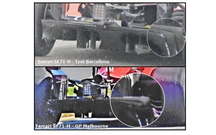 Molto interessante la modifica che è stata apportata alla zona esterna del diffusore delle SF71H per cercare di migliorare il rapporto di espansione del diffusore senza provocare la separazione del flusso. Separazione, questa, che causerebbe una perdita di carico aerodinamico e un aumento della resistenza all’avanzamento.