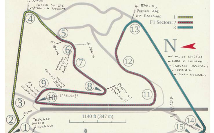 Staccata curva 10: si passa da 270 km/h a 80 km/h, frenata difficilissima, bisogna combinare una frenata intensa con molto angolo sterzo, facile bloccare l'anteriore sinistro e perdere il punto di corda, si passa il brake balance di due punti sul posteriore. Il pilota esercita circa 70 kg di pressione sul freno. Si passa dalla sesta marcia alla seconda marcia.