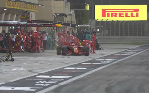 Al giro 36, altro colpo di scena: Raikkonen, in lotta per il podio, finisce la sua gara dopo un cambio gomme non riuscito. La conseguenza è il ritiro del finlandese e il ferimento di un meccanico della Ferrari, finito all’ospedale dopo il contatto con la monoposto di Kimi (Foto Twitter) –