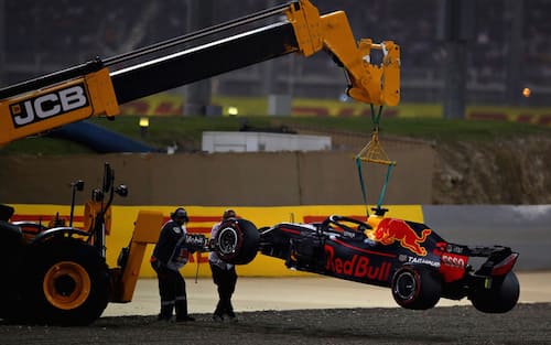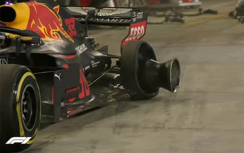 Ad avere la peggio è l’olandese della Red Bull, che fora e deve abbandonare la gara (Foto Twitter) -