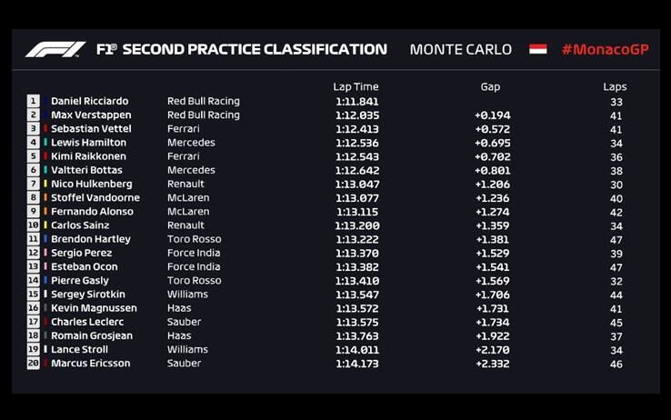 Le prove libere 1 e 2 del Gp di Monte-Carlo sono state letteralmente domiate dalla Red Bull che, nella seconda sessione, è riuscita a battere varie volte il record della pista. Alla fine delle FP2 il miglior tempo è stato realizzato da Ricciardo che, a differenza di Verstappen, ha lavorato per preparare nel migliore dei modi la qualifica sacrificando del tempo alla preparazione della gara. Il pilota australiano è riuscito a realizzare il proprio miglior tempo 15 minuti dopo Verstappen sfruttando il miglioramento della pista.