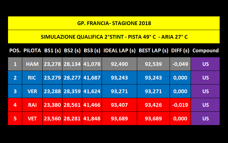 Focalizzando l’attenzione sul primo stint di simulazione qualifica notiamo che Mercedes e Ferrari hanno diversificato il lavoro tra i due piloti mentre Red Bull ha mandato in pista entrambi i suoi driver con la stessa mescola. Hamilton è stato il più veloce con la gomma “rossa” ed è riuscito a rifilare al compagno di squadra oltre mezzo secondo. La prestazione di Bottas con gomma soft, però, è stata sicuramente ottima anche perché sommando i best sector avrebbe potuto ottenere un “giro ideale” con un gap di poco più di 2 decimi da Hamilton nonostante l’utilizzo di una mescola meno performante. Molto staccati Red Bull e Ferrari che, nei confronti della Mercedes, hanno accusato un gap superiore al secondo.