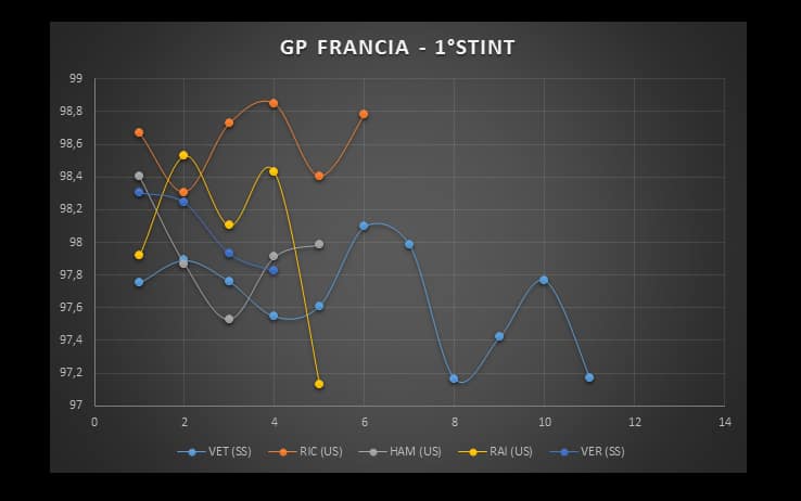 Nell’ultimo stint di gara, poco significativo per i pochi giri percorsi, Vettel si è confermato il più veloce in pista. La differenza sul passo non è spiegabile solo con il minor quantitativo di benzina a bordo dovuto ad un primo stint più lungo rispetto agli altri, infatti se facciamo qualche calcolo sapendo che 10 kg su questo tracciato equivalgono a circa 230 millesimi notiamo che il vantaggio prestazionale di Vettel, dovuto al quantitativo di benzina, è pari a 263 millesimi su Ricciardo, 131 millesimi su Hamilton, 65 millesimi su Raikkonen e 230 millesimi su Verstappen.