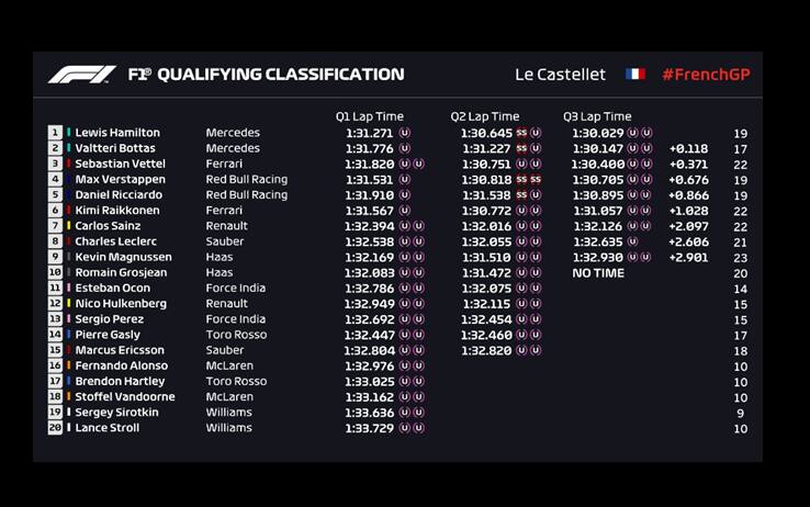 Lewis Hamilton ha confermato le ottime prestazioni viste durante le prove libere di ieri ed ha conquistato la pole position numero 75 in carriera. Prima fila tutta Mercedes grazie all’ottimo giro in Q3 di Bottas che è riuscito a tenersi alle spalle il leader del mondiale Vettel. La Ferrari numero 5 scatterà dalla terza posizione e sarà affiancata dalla Red Bull di Verstappen. Solo terza fila per Ricciardo e per un deludente Raikkonen che, come successo in Canada, non è riuscito a trovare un giro pulito commettendo parecchi errori di guida nell’ultimo stint.